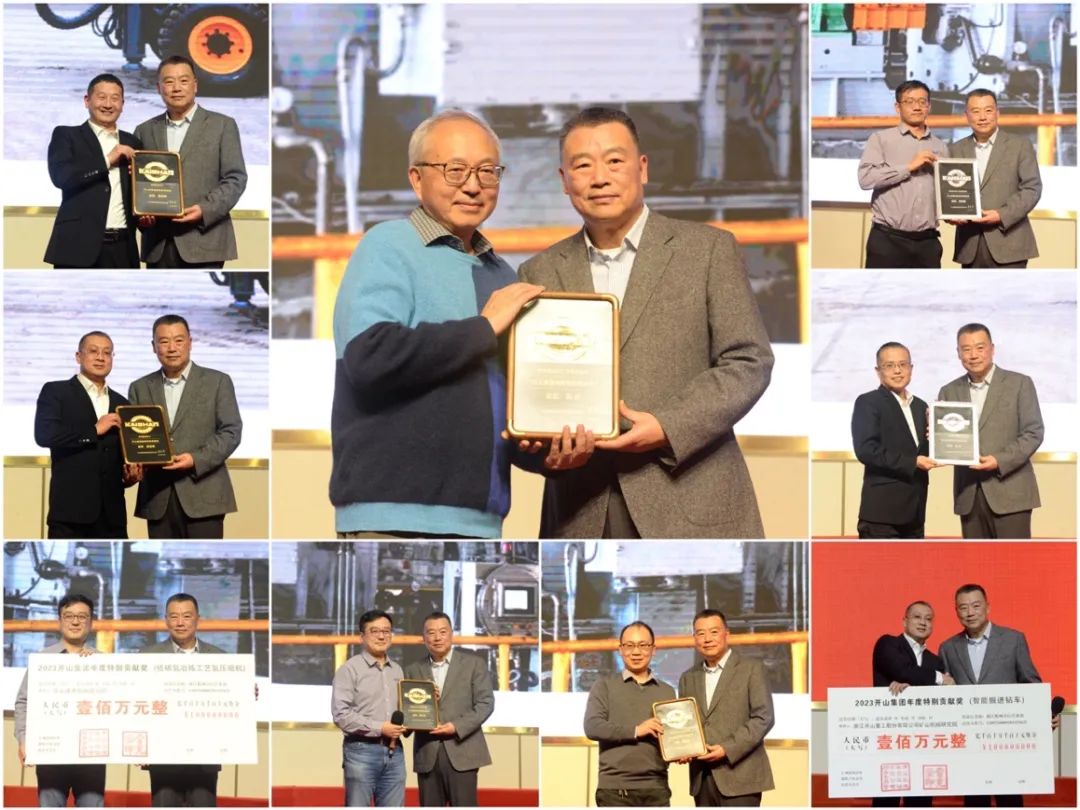 今年年會的重頭戲是首次頒發(fā)的特別貢獻獎。今年的創(chuàng)新特別貢獻獎分別授予了開山重工集團股份有限公司研究院研制的智能掘進鉆車和開山通用機械研究院研制的低碳氫冶煉工藝氫壓縮機,這兩項科研成果在國內(nèi)市場創(chuàng)造了較好的經(jīng)濟效益和社會效益。集團委托上海造幣廠特制的純金獎牌頒發(fā)給了湯炎博士以及夏劍輝、徐雪峰、惠登峰、田兵兵等四位高級工程師;另有純銀獎牌頒發(fā)給了技術(shù)團隊參與兩項創(chuàng)新產(chǎn)品開發(fā)的工程技術(shù)人員。
